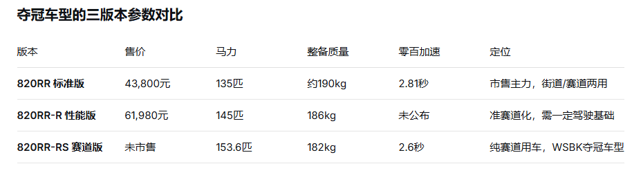 可以直观地看到,820RR标准版的性价比在同级别是碾压级的——约1/3的价格买到接近进口车80%的性能。这也是为什么它被称为“价格屠夫”。